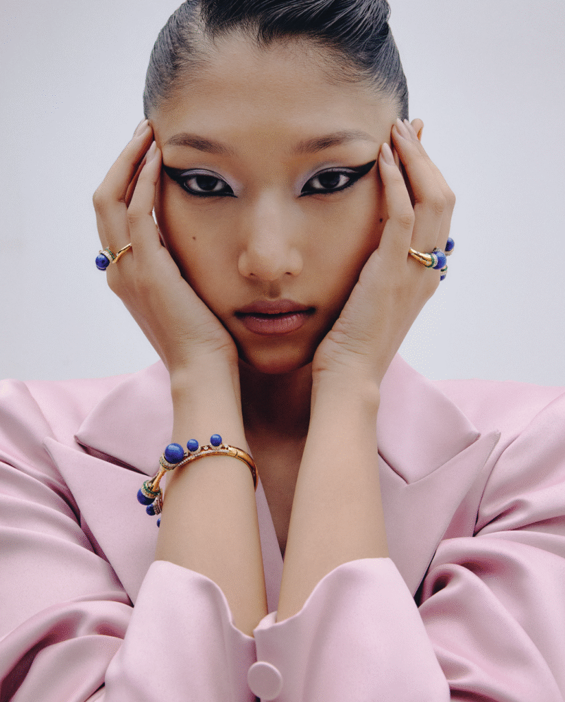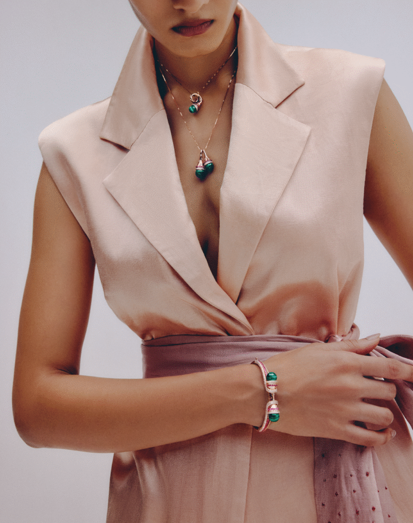 Mèroh’s genius lies in elevating semi-precious stones from consolation prizes vis-a-vis precious gems, to deliberately chosen partners in daily life. Green amethyst, purple amethyst, blue topaz, malachite, turquoise, and lapis lazuli create a palette that speaks to the colors women actually wear. These aren’t your grandmother’s traditional cuts. Each stone is cut to take the shape of the metal that caresses it, creating unique silhouettes that exist nowhere else in the market. The craftsmanship is intentionally unconventional, letting the material guide the form rather than forcing stones into predetermined settings.